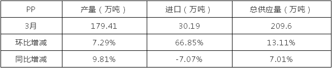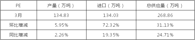 3月份PE產(chǎn)量及進(jìn)口量均有所增加,總供應(yīng)量已攀升到歷史峰值,港口庫存亦處于歷年同期高位,國內(nèi)PE庫存壓力較大,且市場上流通貨源較充裕,將抑制行情的反彈高度和持續(xù)性。