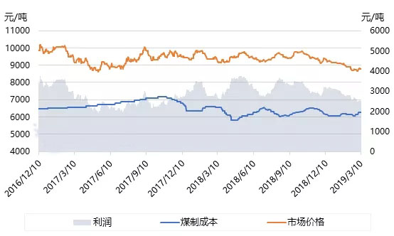 由上圖可見,進(jìn)入2019年,煤制聚乙烯的生產(chǎn)利潤逐漸減少。而增值稅的降低,對西北生產(chǎn)企業(yè)來說,意味著運(yùn)輸成本或有所降低,如當(dāng)前運(yùn)送到山東地區(qū)銷售大約需要300元/噸的運(yùn)輸成本,降稅后或?qū)p少3元/噸,這就進(jìn)一步增加了煤化工生產(chǎn)企業(yè)的利潤空間。
