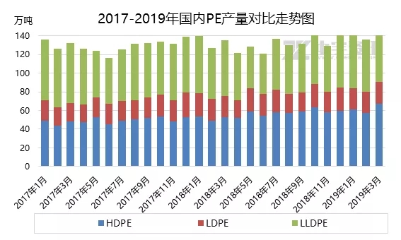 據(jù)統(tǒng)計(jì)數(shù)據(jù)顯示,2019年3月國(guó)內(nèi)PE產(chǎn)量約148.91萬(wàn)噸,環(huán)比增加9.77%,同比增加10.44%。其中,LDPE產(chǎn)量環(huán)比增加2.28%,同比增加1.88%;HDPE產(chǎn)量環(huán)比增加17.41%,同比增加27.39%;LLDPE產(chǎn)量環(huán)比增加5.02%,同比減少1.26%。下面我們一起來(lái)看一下年內(nèi)一季度PE生產(chǎn)情況。