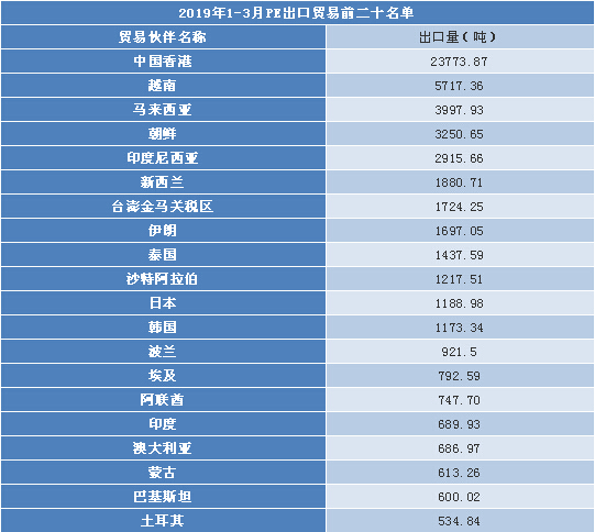 根據海關統(tǒng)計數(shù)據顯示,一季度PE市場出口量呈現(xiàn)較大幅度的增長,2019年1-3月PE共計出口6.29萬噸,比去年同期增長39.16%。出口數(shù)據呈現(xiàn)對主要市場貿易對象出口數(shù)量普遍增長以及貿易區(qū)域集中化程度高兩大特點。