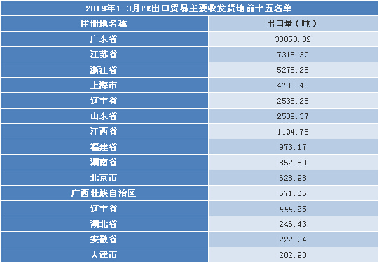 從上表可以看出,貿易區(qū)域布局集中化程度高。中國PE出口收發(fā)貨地主要集中于沿海的廣東省、江蘇省和浙江省。2019年1-3月廣東省、江蘇省、浙江省共計出口4.64萬噸,占出口總量的75.13%。具體到各省份來看,廣東省累計出口3.39萬噸,較去年同期增加45.49%;江蘇省累計出口0.73萬噸,較去年同期增加52.08%;浙江省累計出口0.53噸,較去年同期增加26.19%。