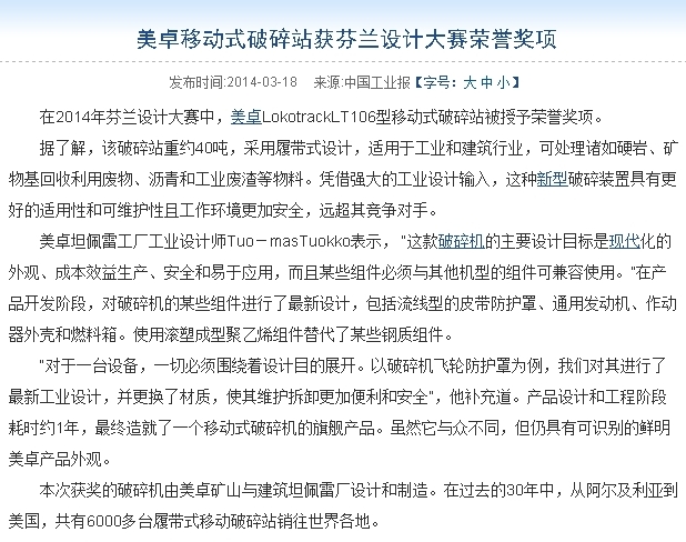 【2014-3-18】美卓移動(dòng)式破碎站獲芬蘭設(shè)計(jì)大賽榮譽(yù)獎(jiǎng)