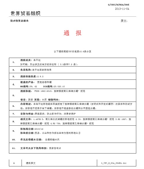 【2013-11-04】烏干達(dá)發(fā)布滾塑聚乙烯儲(chǔ)罐的強(qiáng)制標(biāo)準(zhǔn)
